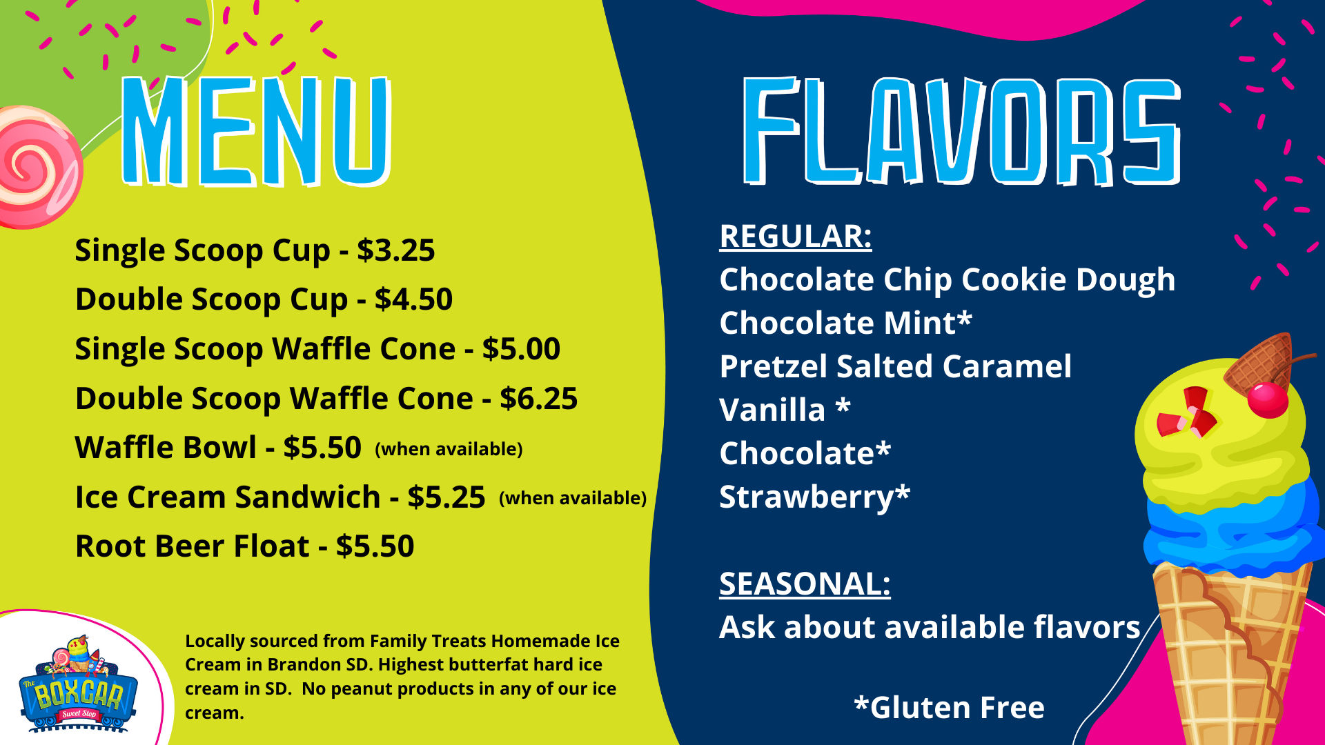Hard ice cream made with 14% butterfat and no peanuts, tree nuts, or eggs in the ice cream. Our ice cream is made in Brandon South Dakota. Come try our waffle cones and bowls made fresh on site. And be sure to visit our toy store and candy store.